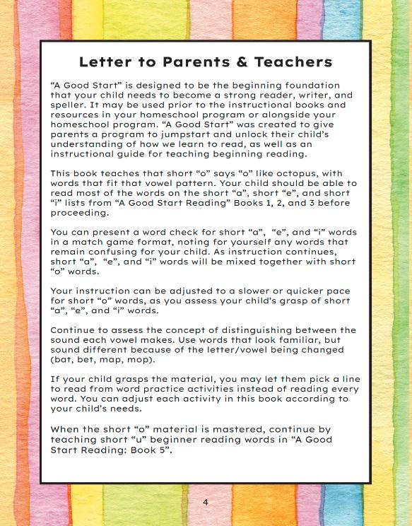 This digital version of Book 4 in the A Good Start Reading series focuses on short “o” vowel words like hot, log, dog, pot. It continues the step-by-step phonics instruction that builds fluency and foundational reading skills.